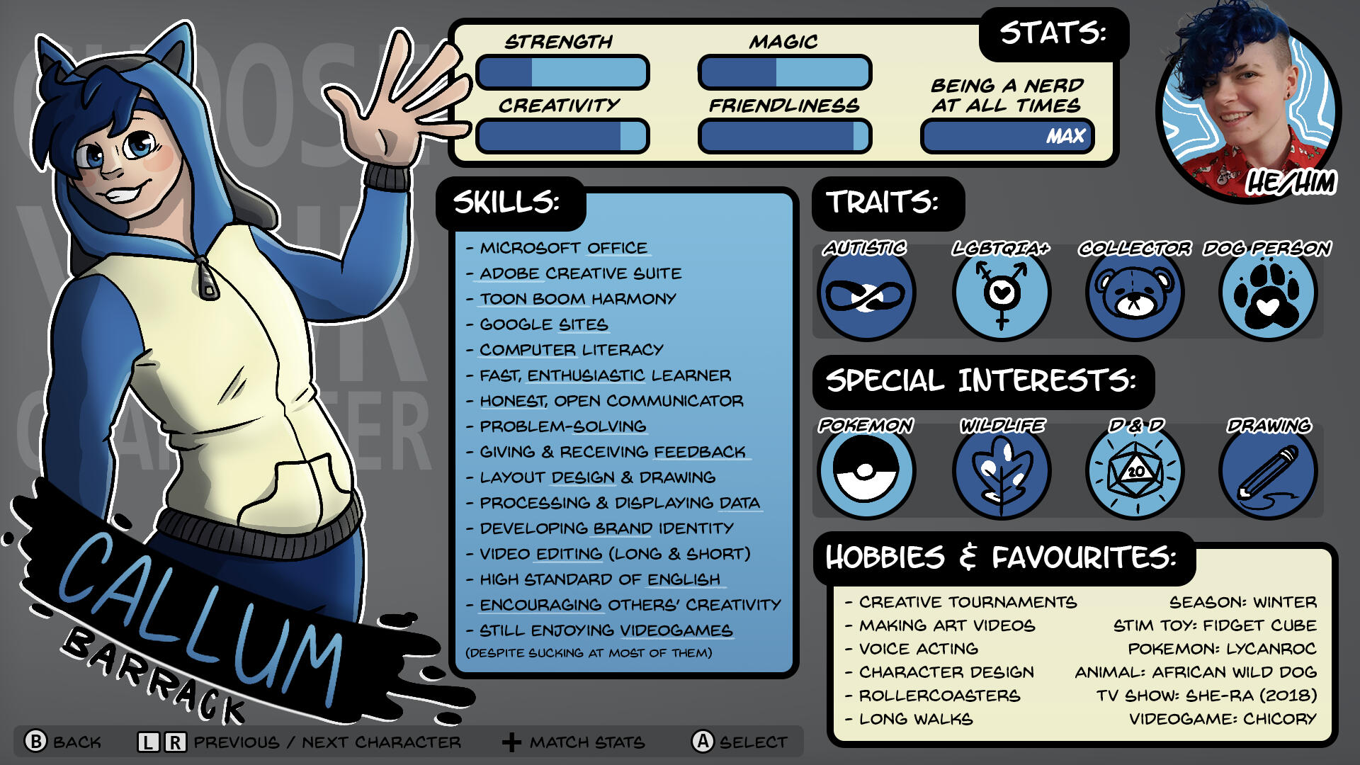 Joined Spectrum Gaming: 9th January 2023Special Interests: drawing, writing, Pokémon, Dungeons & Dragons / Daggerheart, dogs (and animals in general)